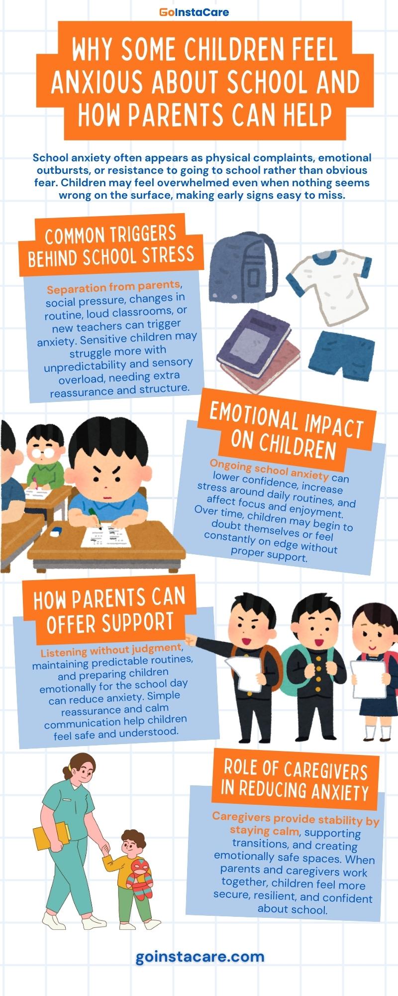 School anxiety doesn't always show itself as obvious discomfort. It might happen in everyday situations. Some youngsters don't want to get dressed for school, say their stomach hurts, or stop talking. Some people might seem upset, angry, or tired after school. These reactions often show emotional stress instead of behavioural problems.