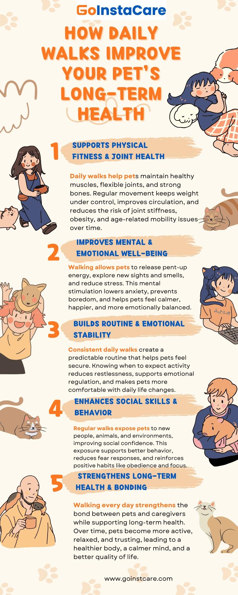 Walking every day is good for your joints, mobility, flexibility, and weight control. Moving around regularly makes muscles stronger, less stiff, and less likely to become overweight. It also helps pets of all ages feel better physically and overall.
