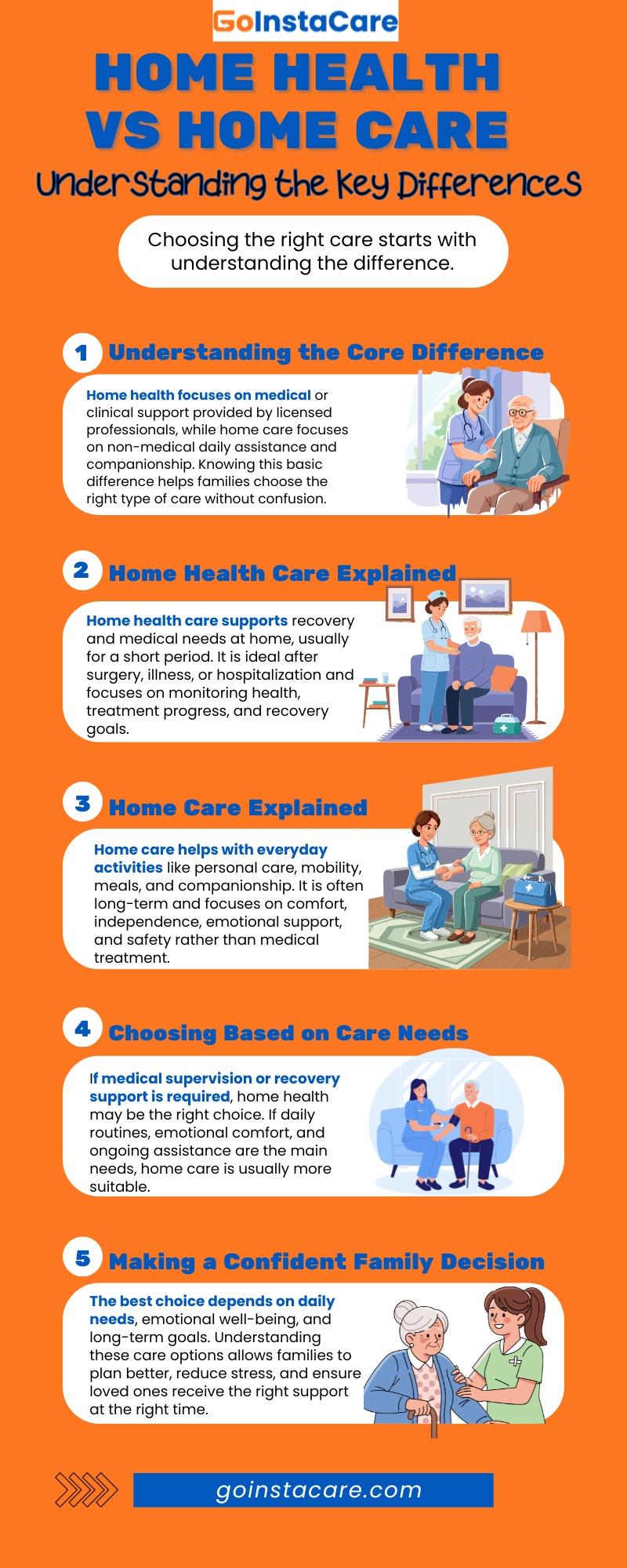 Families at GoInstaCare benefit when care alternatives are straightforward and not scary. By knowing the difference between home health and home care, families may choose the service that works best for them. Clarity keeps expectations in line and lowers emotional stress.