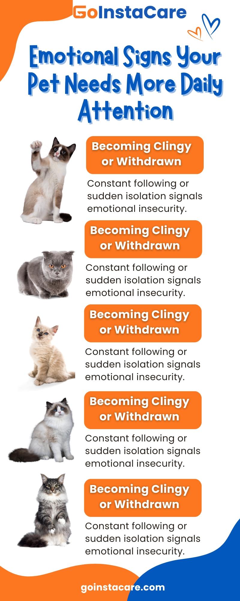 Pets may exhibit clinginess, disengagement, restlessness, excessive vocalisation, alterations in sleep patterns, or abrupt mood changes, indicating unfulfilled emotional needs rather than physical health issues.