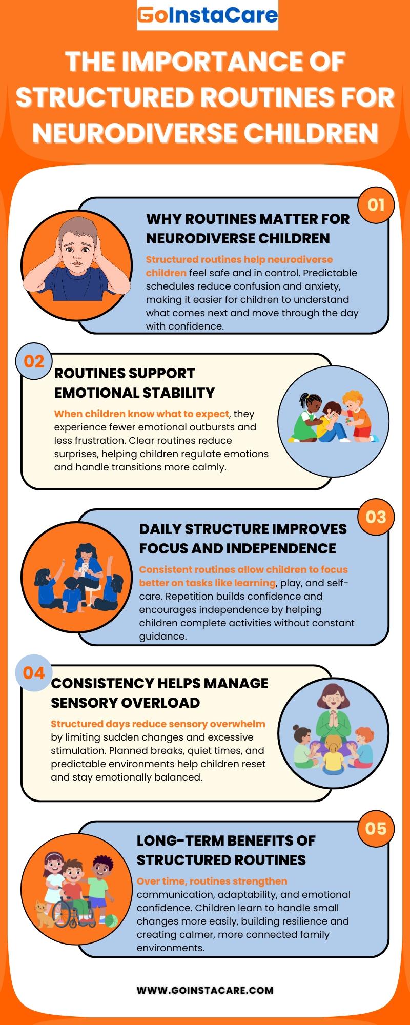 Structured routines are really good for neurodiverse kids because they make them feel safe, confident, and emotionally stable. Many kids with autism spectrum disorders, ADHD, sensory issues, and developmental delays feel less stressed and better able to understand their day when they have predictable routines. Routines help people get things done without being surprised or confused by providing them a sense of control.